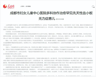 圖片來源:2020年7月16日人民網(wǎng)四川頻道報(bào)道《成都市婦女兒童中心醫(yī)院多科協(xié)作治愈罕見先天性血小板無力癥患兒》