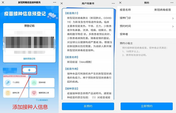 點(diǎn)擊頁面下方的「個(gè)人預(yù)約」,閱讀用戶同意書,點(diǎn)擊「去預(yù)約」,選擇疫苗接種門診、預(yù)約時(shí)間、受種者,點(diǎn)擊“立即預(yù)約”即可。
