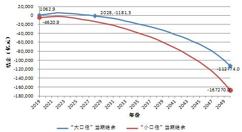 2019-2050年全國企業(yè)職工基本養(yǎng)老保險基金當(dāng)期結(jié)余預(yù)測,來源于《中國養(yǎng)老金精算報告 2019-2050》