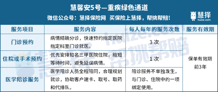 除以上的亮點(diǎn)責(zé)任外,慧馨安5號(hào)終身版還可以享受重疾綠通服務(wù)。
