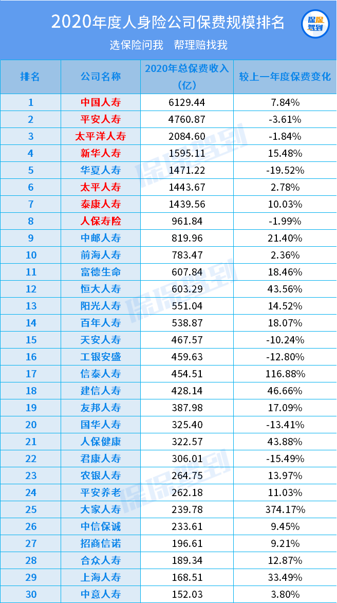 各大保險公司的保費規(guī)模排名