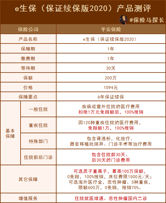 例如,平安保險的e生保(保證續(xù)保版2020)
