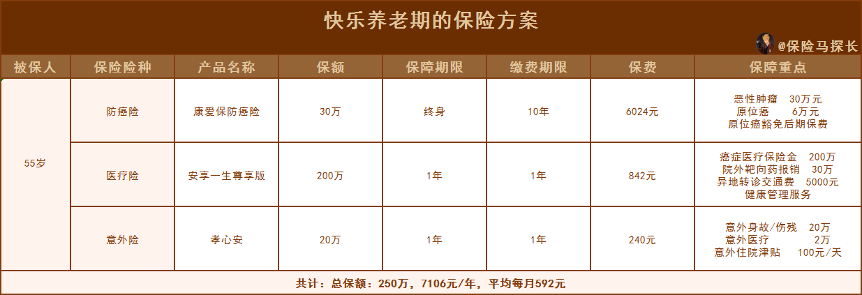 建議配置:醫(yī)療險(買健康告知寬松的)+老人意外險+防癌險。