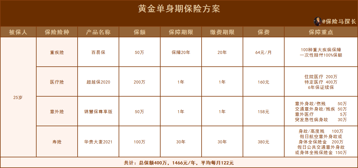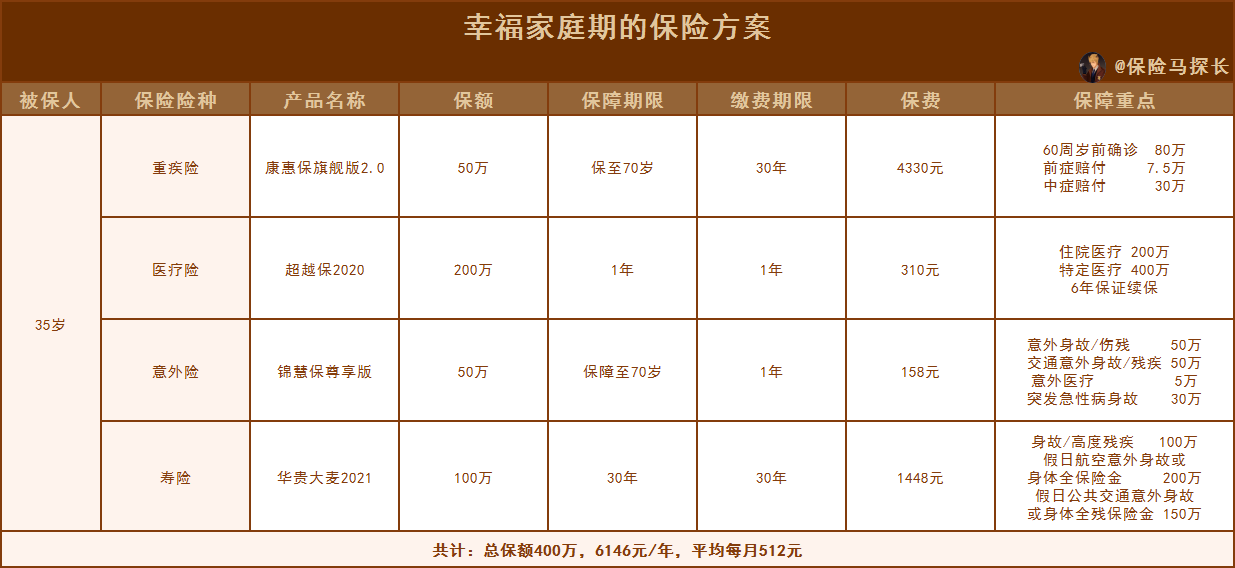 建議配置:重疾險+醫(yī)療險+意外險+定期壽險