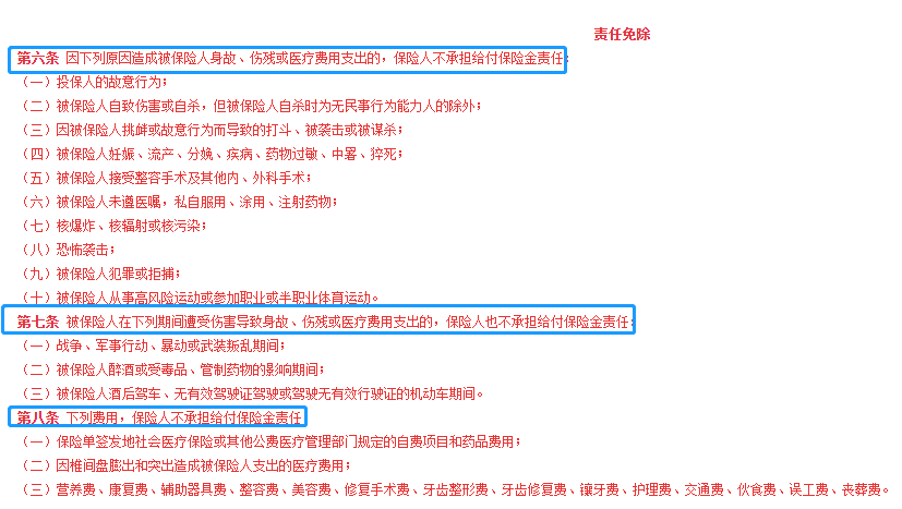 還有特別要注意:意外險(xiǎn)不賠的情況。這個(gè)部分會(huì)在保險(xiǎn)合同中特別標(biāo)注出來,【責(zé)任免除】的部分一定要知道: