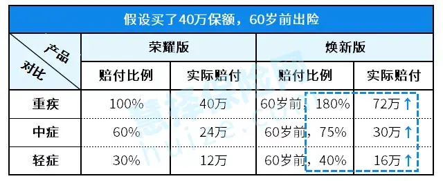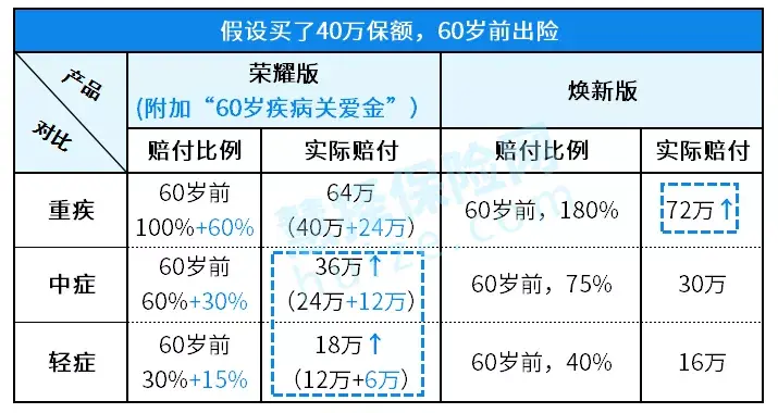 無論榮耀版是否附加疾病關(guān)愛金,煥新版的“60歲前重疾賠付”都更高。