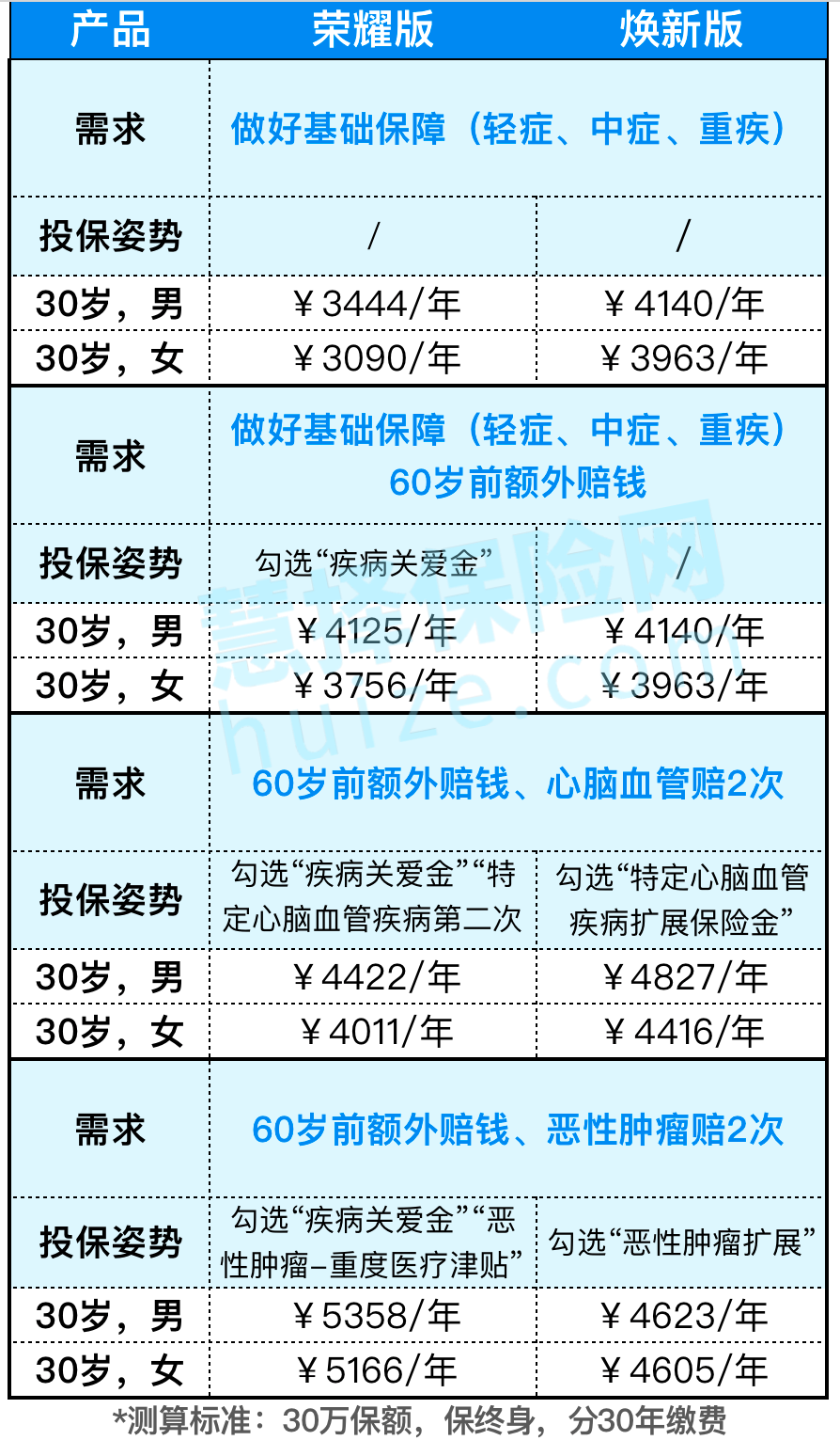 兩款間隔期一樣,煥新版賠的錢多,榮耀版保的病多。
