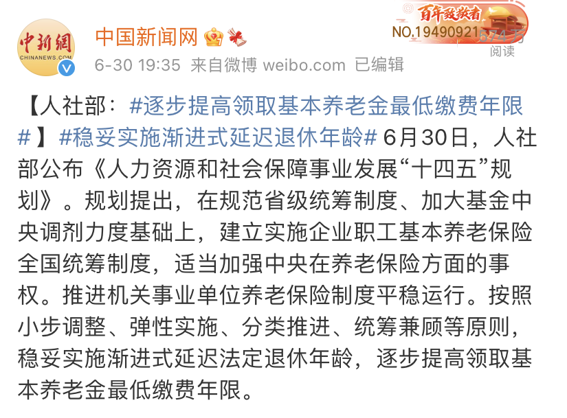 2021年6月30日,提出養(yǎng)老金交費(fèi)年限延長(zhǎng)