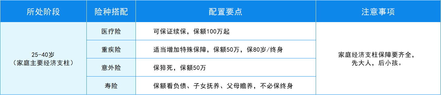 這個(gè)階段的投保思路是:醫(yī)療險(xiǎn)+重疾險(xiǎn)+定期壽險(xiǎn)+意外險(xiǎn)