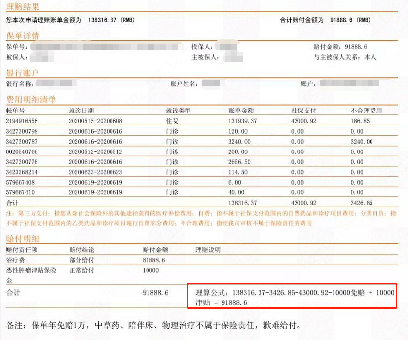 理賠賬單金額是13.8萬(wàn),最終賠付9.1萬(wàn)元。具體怎么算呢?