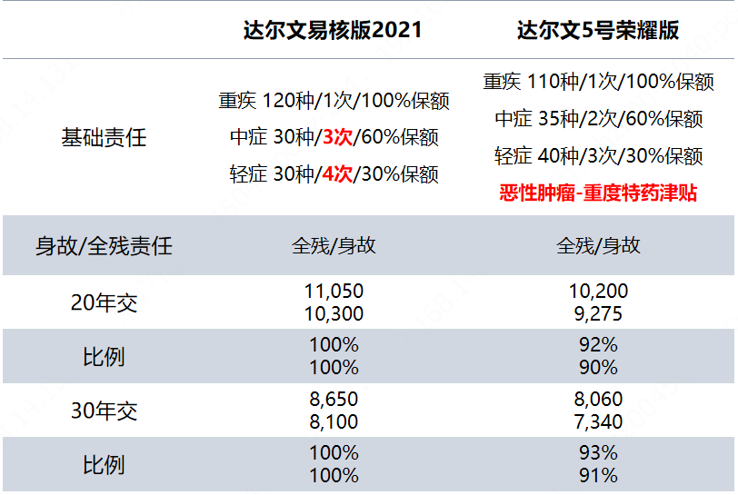 我們以目前重疾險價格洼地——達爾文5號榮耀版,來和易核版2021做個產(chǎn)品對比。