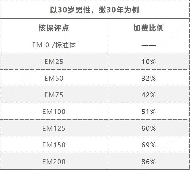 以30歲男性投保達爾文易核版2021,選30年交費為例,核保評點與加費比例關系如下: