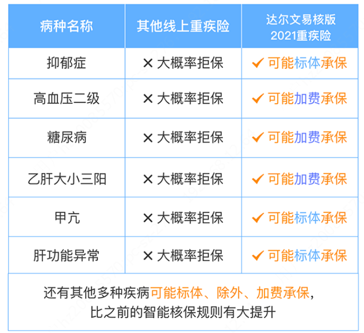 達爾文易核版2021對很多常見拒保疾病,都進行了核保優(yōu)化。