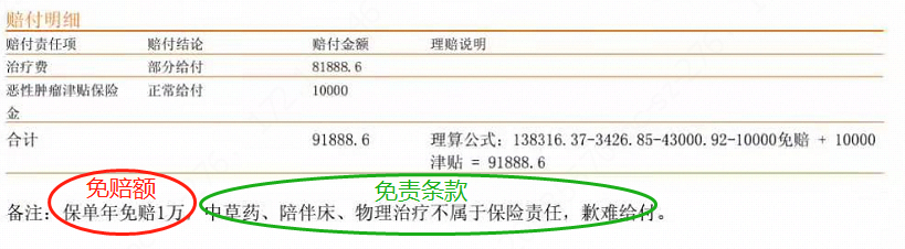 以一個(gè)真實(shí)的醫(yī)療險(xiǎn)理賠單為例,免賠額、免責(zé)條款都是除外的。