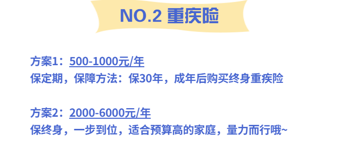 2、如果預(yù)算夠,可以優(yōu)先考慮終身型重疾險(xiǎn),經(jīng)濟(jì)條件一般的可以先買保障20、30年的定期型,實(shí)在不行就先買一年型的做補(bǔ)充;