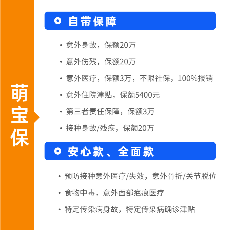 想要比較全面的保障(如意外骨折、關(guān)節(jié)脫位、食物中毒、意外面部疤痕醫(yī)療等),可考慮全面版的萌寶寶,價格也不貴。