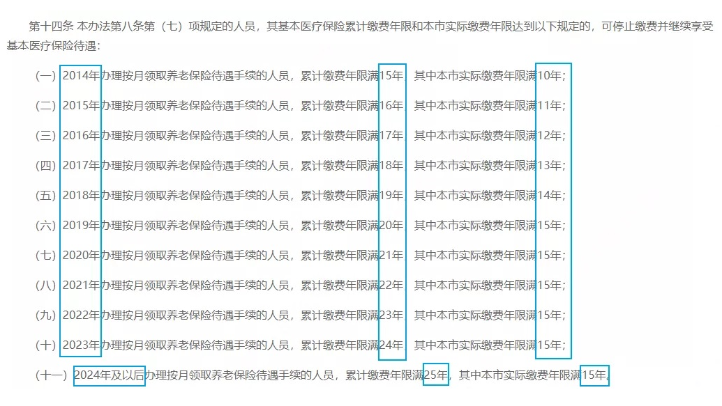 深圳規(guī)定,只要社保累計(jì)繳滿規(guī)定年限(見(jiàn)下圖),退休后就可以不用再繳費(fèi),享受終身醫(yī)保待遇。