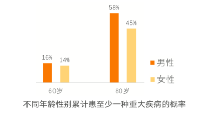 到80歲,男性累計(jì)患至少一種重疾的概率是58%、女性是45%。