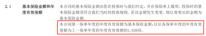 比如金滿意足臻享版,每年的有效保額就是按照3.8%復(fù)利遞增: