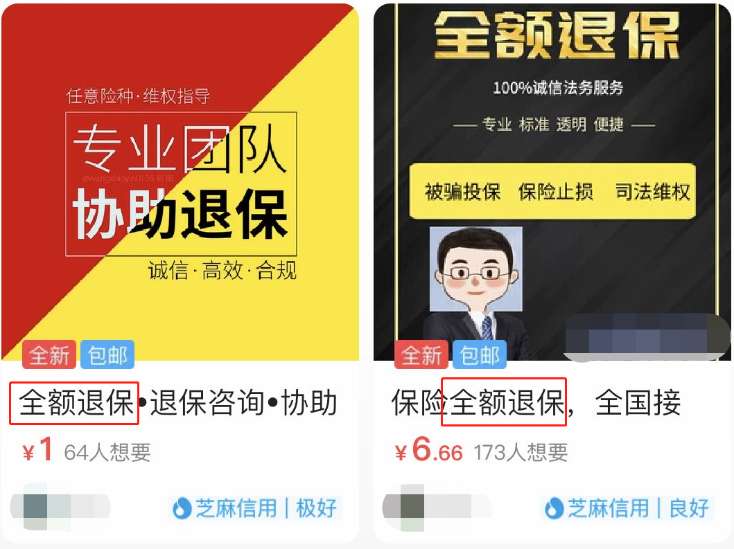 這個(gè)時(shí)候呢,一些“退保代理”就出場(chǎng)了。他們通常會(huì)打著“全額退保的名義,在貼吧、某魚等地方散布釣魚信息。