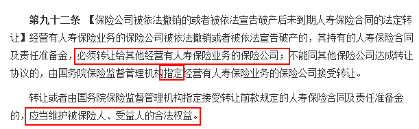 第三,國家會幫忙找“接盤俠”,《保險(xiǎn)法》第九十二條對保險(xiǎn)公司的破產(chǎn)轉(zhuǎn)讓說明: