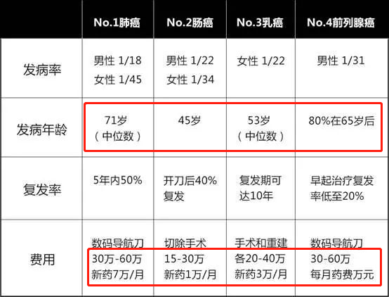 而且,通過數(shù)據(jù)可以看到,一些高發(fā)惡性腫瘤大多集中在40-65歲、甚至更靠后的年齡段: