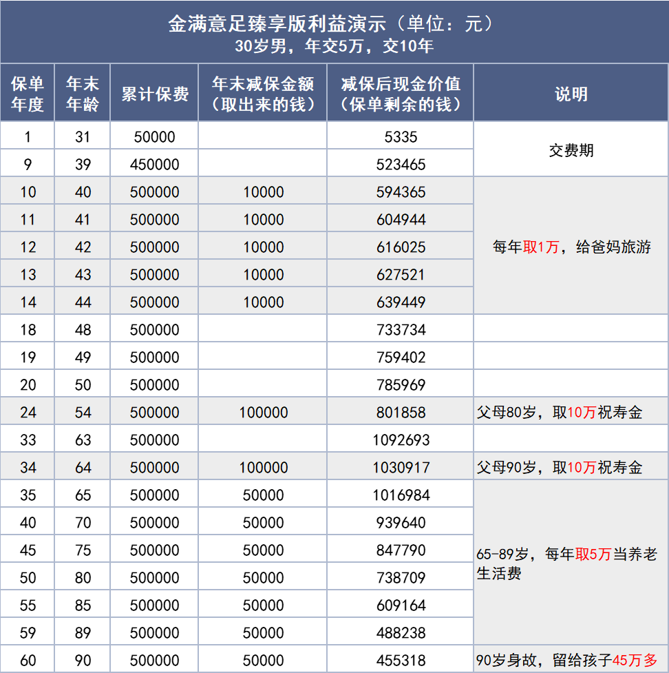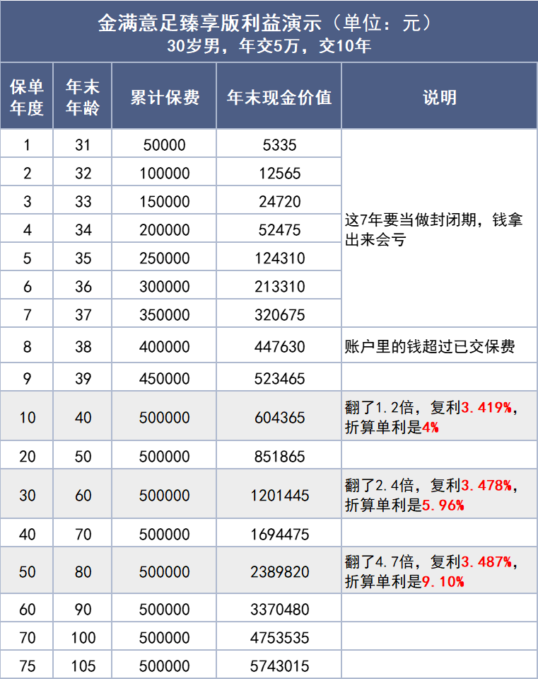 舉個(gè)例子:以30歲老王,年交5萬交10年為例,如果錢一直不用,現(xiàn)金價(jià)值不斷