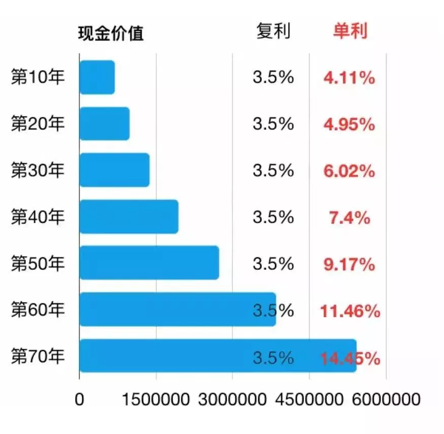 第30年增長(zhǎng)到120萬多,復(fù)利3.478%,折算單利有5.96%;