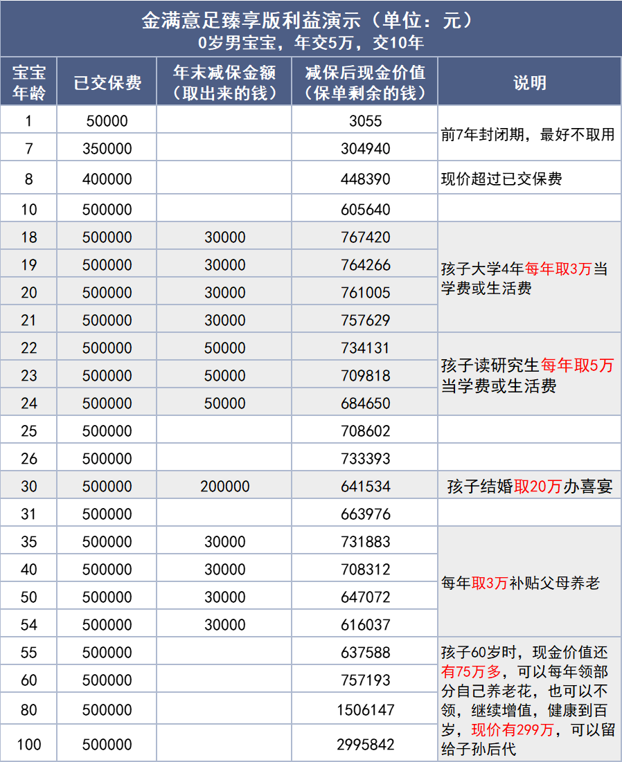 假設(shè)30歲媽媽給剛出生的男寶寶買,年交5萬,交10年。資金可以這么安排: