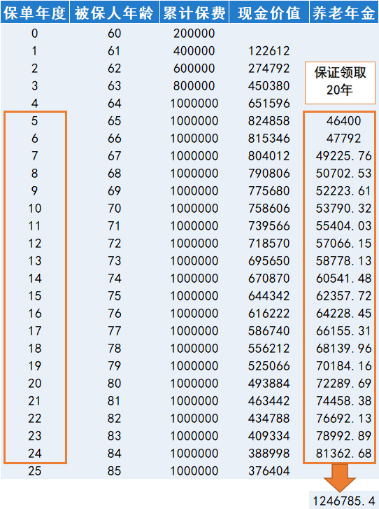 方案二:(延遲退休)60歲投保,5年交,每年20萬(wàn),65歲領(lǐng)取
