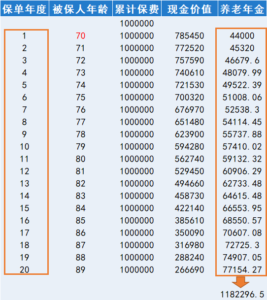 如果是69歲的高齡投保,1次性投入100萬(wàn),第二年就能領(lǐng)取,保證領(lǐng)取也能達(dá)到118萬(wàn)
