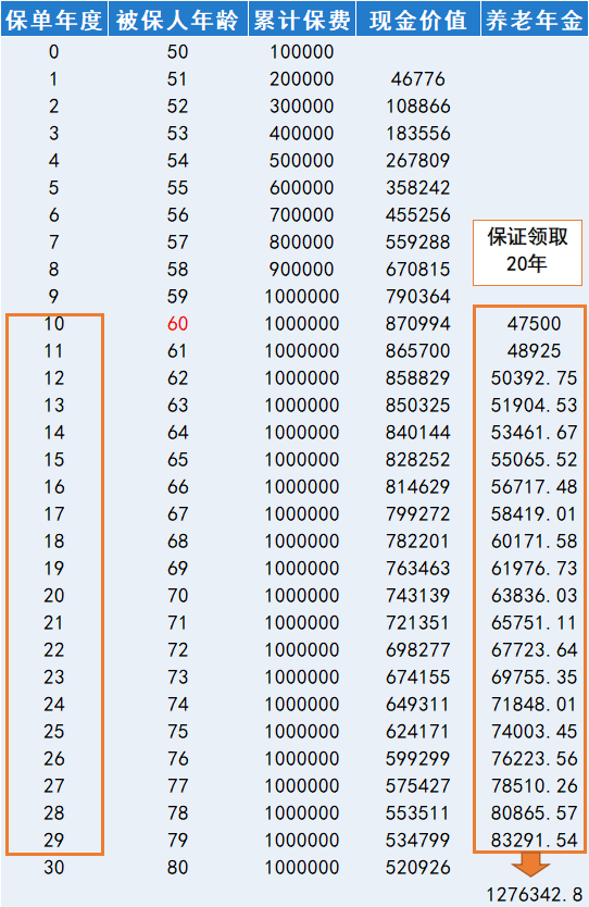 方案一:(接近退休)50歲投保,10年交,每年10萬(wàn),60歲領(lǐng)取