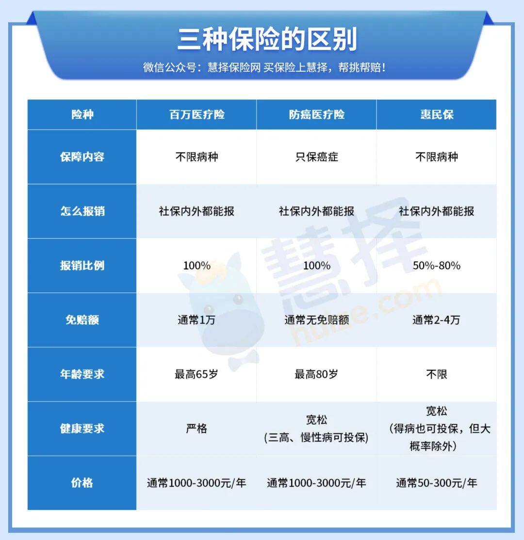 適合老年人的醫(yī)療險,主要有百萬醫(yī)療險、防癌醫(yī)療險、惠民保,關于三者的區(qū)別,列在下方表格里了: