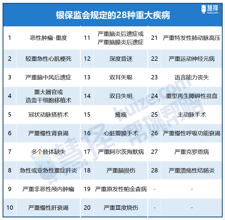 不同的產(chǎn)品,保障的疾病會有差別,但以下28種高發(fā)的疾病保障是一定會有的: