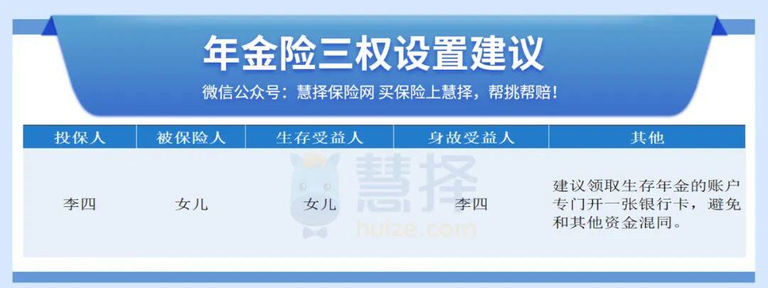 在女兒結(jié)婚前,這張保單已經(jīng)完成繳費(fèi)。并且,年金險(xiǎn)的領(lǐng)取賬戶單獨(dú)開了一張銀行卡,避免資金混同。
