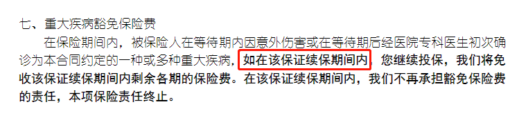 就是說,如果患上了條款里110種重疾中的一種,那么5年保證續(xù)保期內(nèi),剩下的保費就不用交了,保障依然有效。