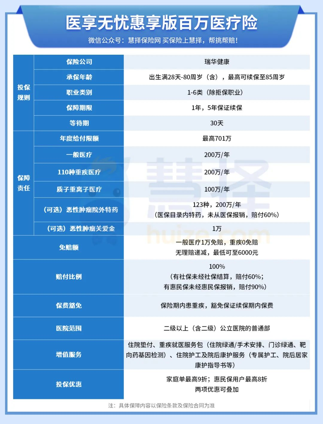 醫(yī)享無憂惠享版百萬醫(yī)療險瑞華瑞醫(yī)保個人醫(yī)療保險(互聯(lián)網(wǎng))5年保證續(xù)保可選院外抗癌特藥惠民保用戶8折優(yōu)惠1-6類職業(yè)可投了解商品