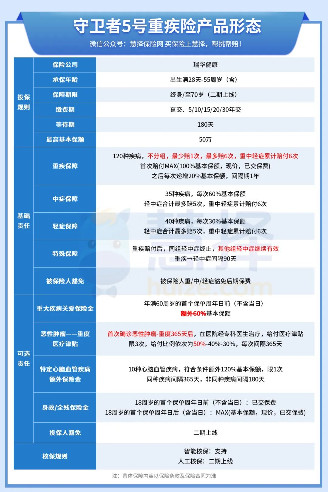 守衛(wèi)者5號是一款多次賠付的重疾險,疾病可賠次數(shù)多,重、中、輕癥共享6次賠付機會,重疾至少賠1次。