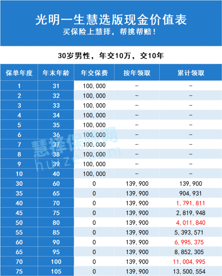 30歲男性,每年交10萬,選擇交10年、保終身,60歲開始領(lǐng)??;