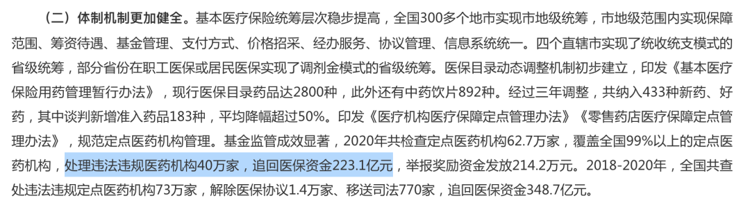 (來(lái)源:《醫(yī)?;鸨O(jiān)管藍(lán)皮書(shū):中國(guó)醫(yī)療保障基金監(jiān)督管理發(fā)展報(bào)告(2021)》(以下簡(jiǎn)稱(chēng)《藍(lán)皮書(shū)》)新聞發(fā)布會(huì))