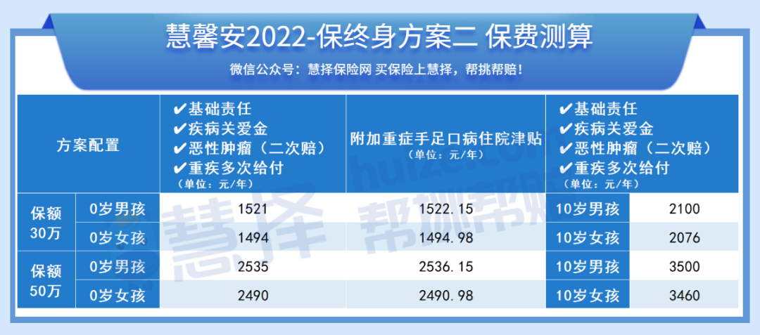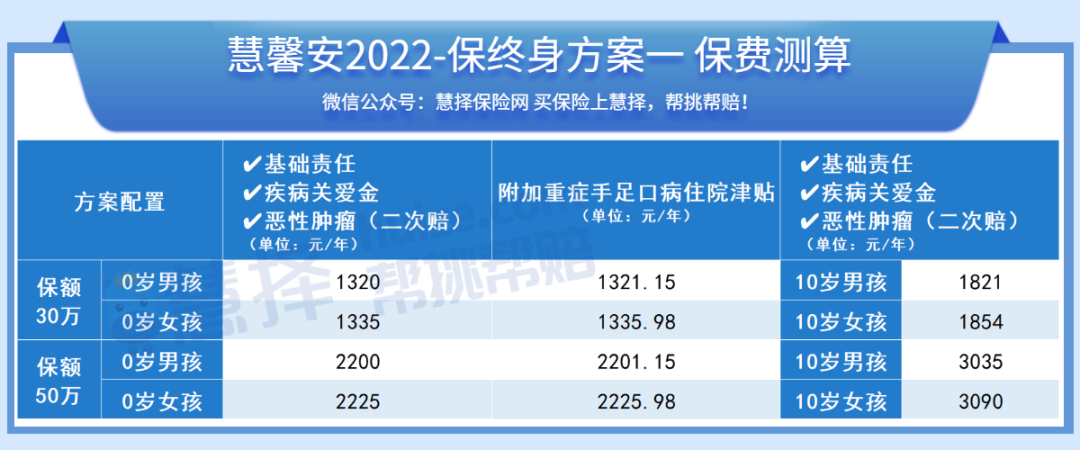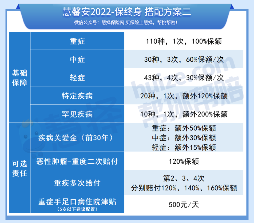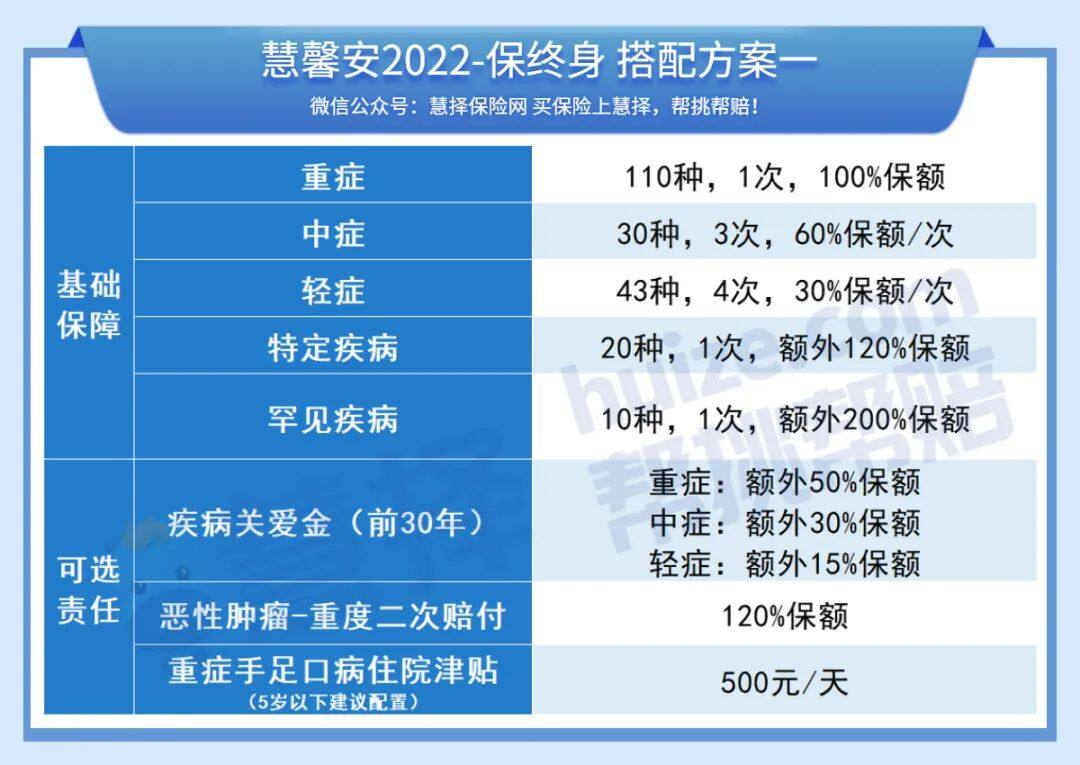 選擇慧馨安2022,保終身,附加“疾病關愛金”,5歲以下建議附加“重癥手足口病住院津貼”,再附加“惡性腫瘤二次賠付”或者“重疾多次賠”。