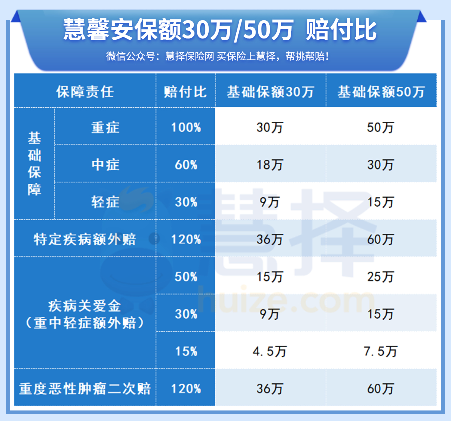 慧馨安2022可以賠付重癥保額100%,疾病關愛金50%,特定疾病保險金120%,總共可以賠付270%*基本保額。