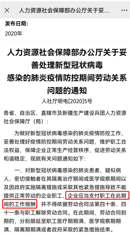 早在2020年,國家人社部就特意說了:隔離期間,公司要發(fā)工資。