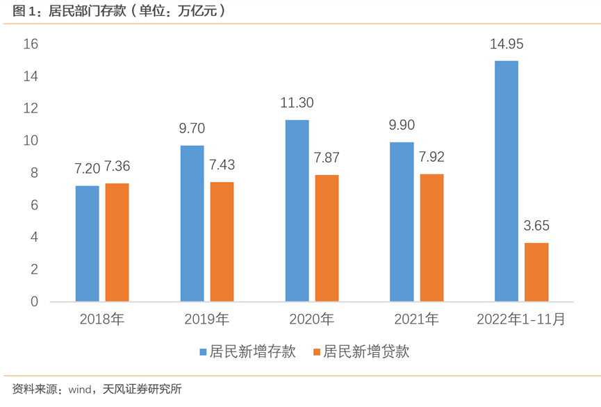 根據(jù)今年的金融統(tǒng)計數(shù)據(jù),2022年1-11月,居民部門新增存款14.9萬億,預計2022年全年居民部門新增存款或超過16萬億,大幅高于往年水平(2019、2020、2021年分別為9.7萬億、11.3萬億和9.9萬億)。