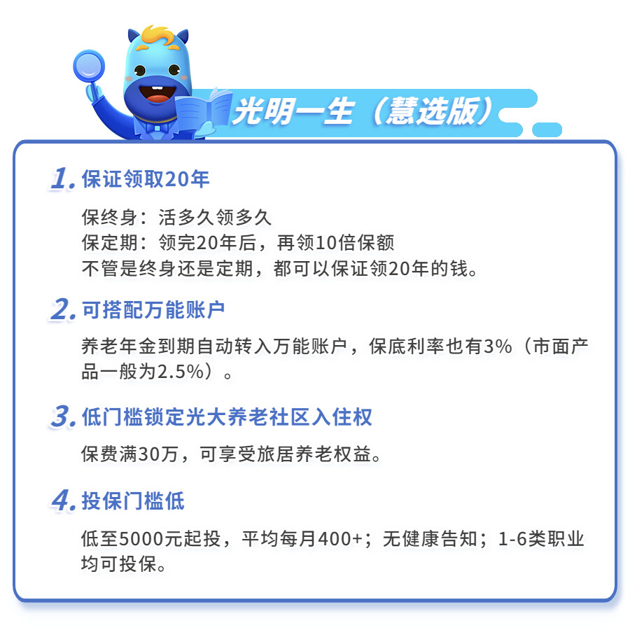 光明一生(慧選版)養(yǎng)老年金保險產(chǎn)品計劃光大永明光明一生(慧選版)養(yǎng)老年金保險品質(zhì)養(yǎng)老社區(qū)保證領(lǐng)取20年定期/終身保障可搭配萬能賬戶了解商品