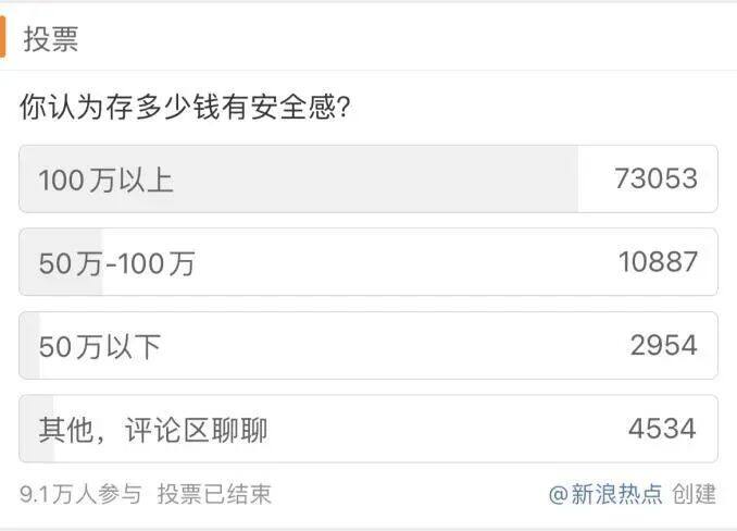 最近微博發(fā)起了這么一個投票“你認(rèn)為存多少錢能有安全感?”,9.1萬人參與,多數(shù)人覺得要100萬以上存款。