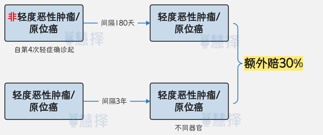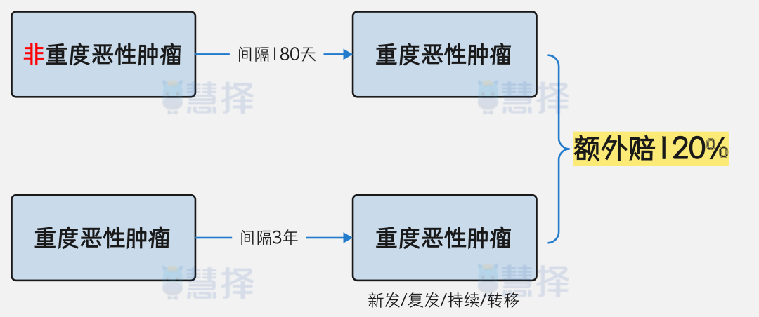 前后兩次得的都是重度惡性腫瘤,只要間隔3年,無論是新發(fā)、復(fù)發(fā)、持續(xù)、轉(zhuǎn)移,都能賠120%。