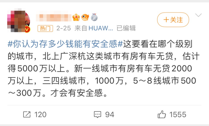 更有大V按照城市劃分,給出了北上廣深杭要“有房有車無貸,5000萬以上”的標(biāo)準(zhǔn)。