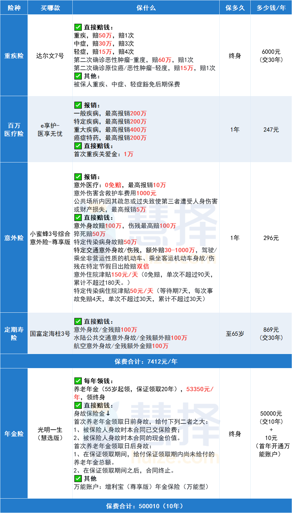 這里安排了4大險種+年金險,基本涵蓋了日常絕大部分風(fēng)險。大家可做個參考,再根據(jù)自身情況做增減。
