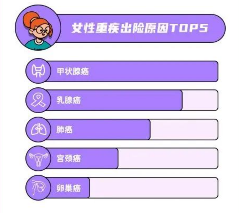 而女性重疾出險原因前五,都與癌癥有關(guān)。